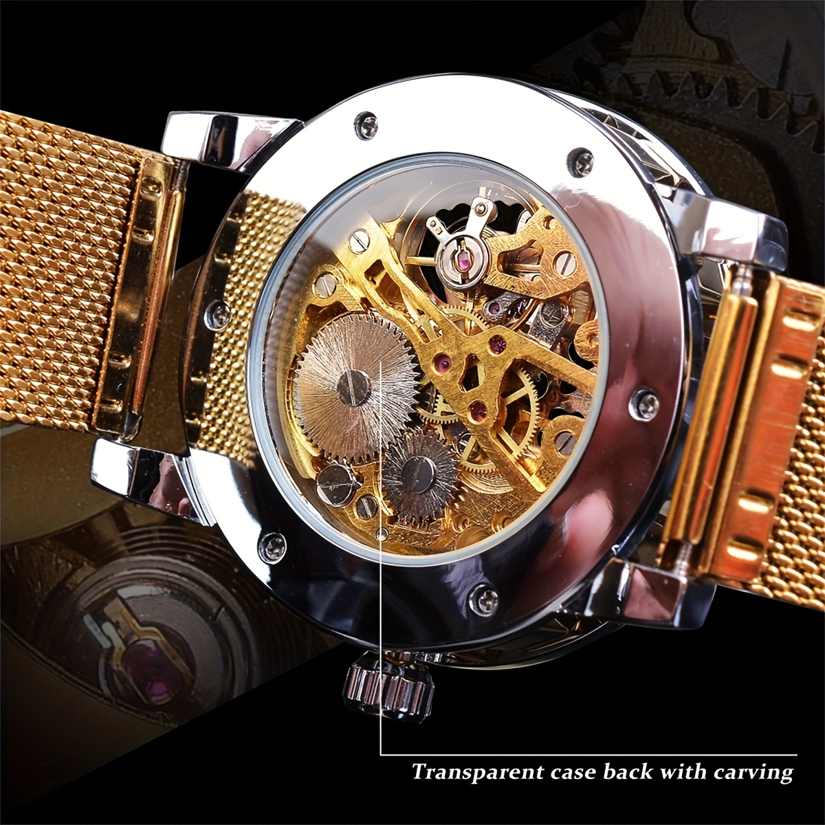 1pc Elegant Men's Mechanical Watch with Rhinestone Accents, Golden-Tone Hollow Mesh Band, Stainless Steel & Zinc Alloy Case, Self-Winding Movement, No Battery Needed - Business Style Luxury Watch for Formal & Casual Wear, For