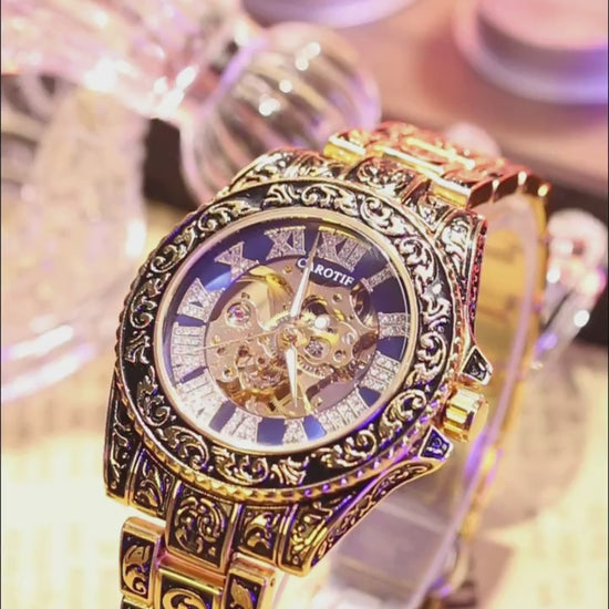 1pcss Men'S Golden Green Steel Belt Retro Style Classical Fashion Rose Carving Automatic Mechanical Watch